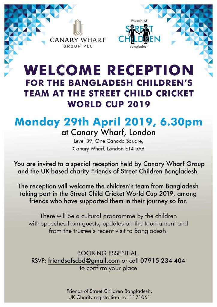 You are invited to a special reception held by Canary Wharf Group and the UK-based charity Friends of Street Children Bangladesh. The reception will welcome the children’s team from Bangladesh taking part in the Street Child Cricket World Cup 2019, among friends who have supported them in their journey so far.
