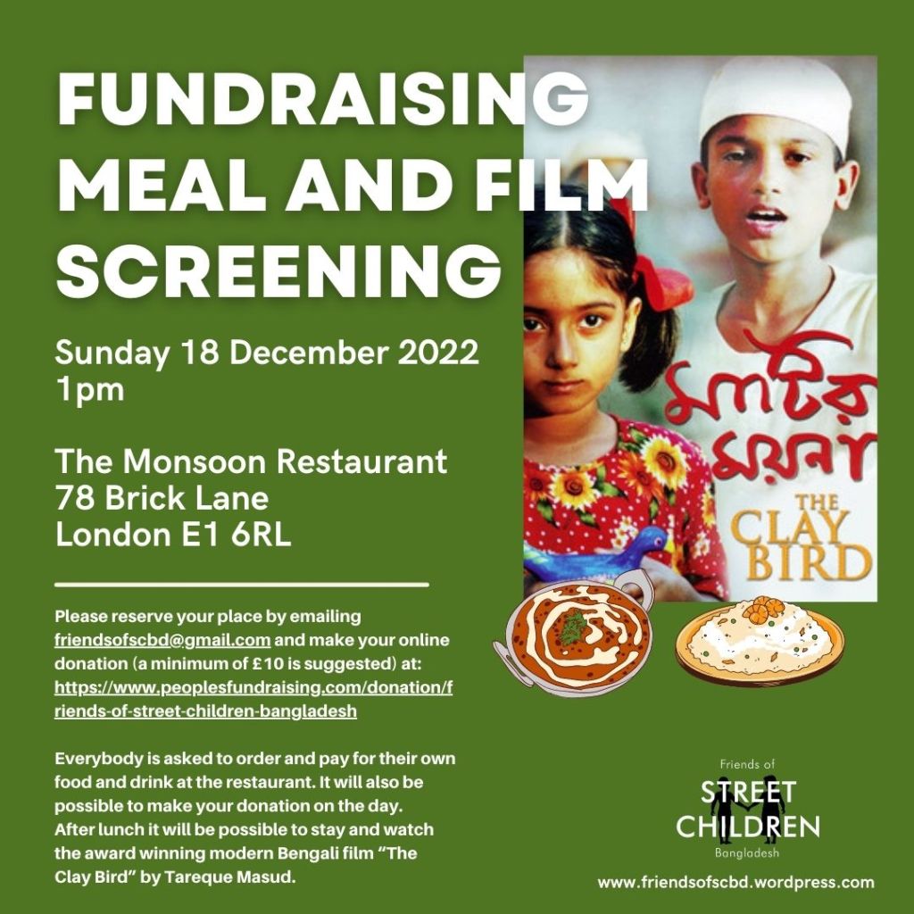 On Sunday 18th December 2022 please join us for lunch on Brick Lane at 1pm. This is our end of year fundraising event and is being held at The Monsoon Restaurant, 78 Brick Lane, London E1 6RL. After the meal we will show the award winning modern Bengali film “The Clay Bird” by Tareque Masud. The film tells the story of a family torn apart by religion and war, touching on themes of religious tolerance and cultural diversity.