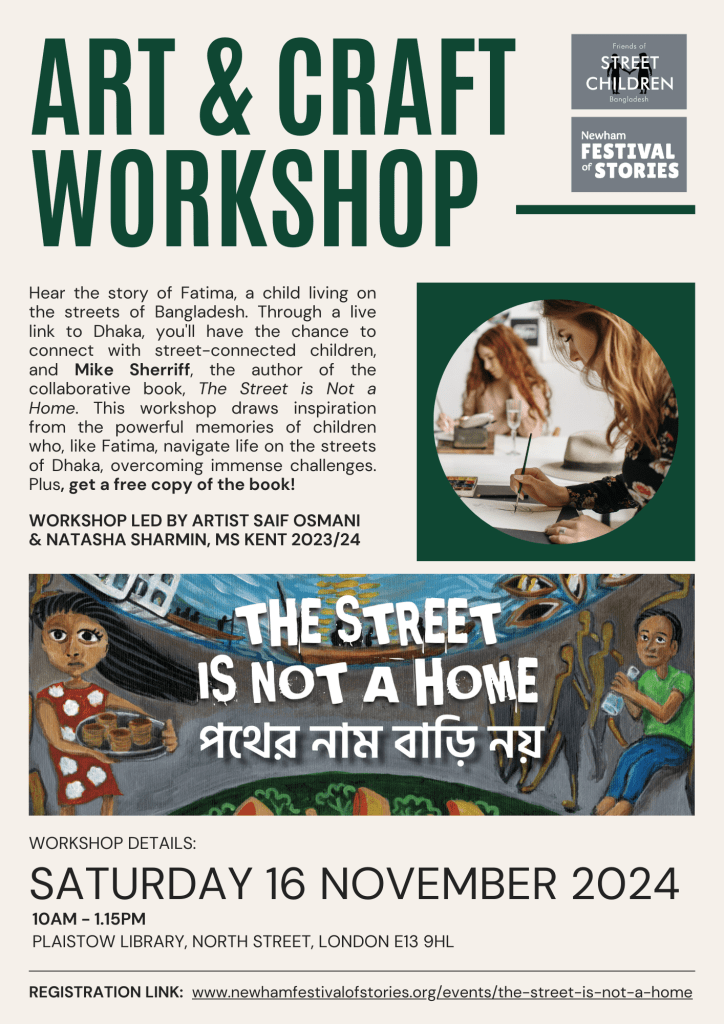 Places for the workshop: free, and limited. Visit the Newham Festival of Stories website: https://www.newhamfestivalofstories.org/events/the-street-is-not-a-home