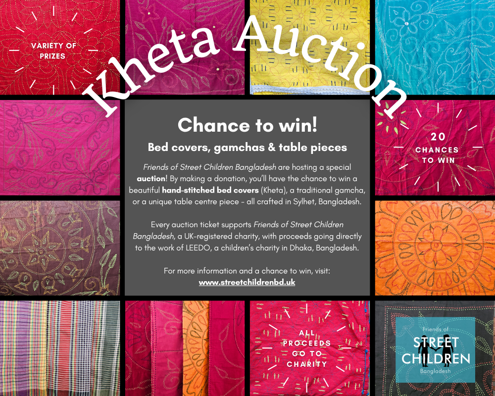 Friends of Street Children Bangladesh are hosting a special auction! By making a minimum donation of £10, you’ll have the chance to win a beautiful hand-stitched bed cover (Kheta), a traditional gamcha, or a unique table centre piece – all crafted in Sylhet, Bangladesh. There’s over 20 prizes to be won.