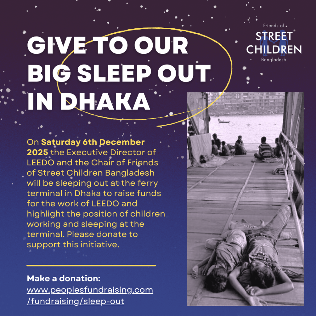 On Saturday 6th December, our Chairperson Mike Sherriff and LEEDO’s Executive Director Forhad Hossain will spend a night sleeping out at the Dhaka ferry terminal, joined by LEEDO staff and committee members. They’re hoping to raise £1,500 to support LEEDO’s work in 2026 and to shine a light on the children who live and work at the terminal.