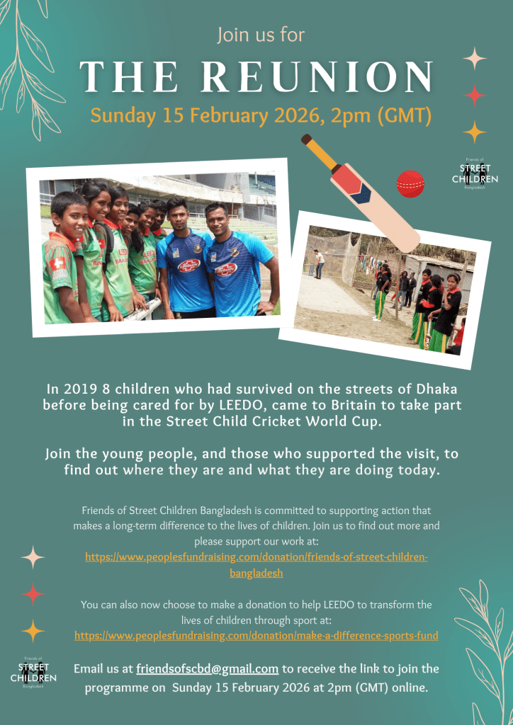 In 2019 8 children who had survived on the streets of Dhaka before being cared for by LEEDO, came to Britain to take part in the Street Child Cricket World Cup.